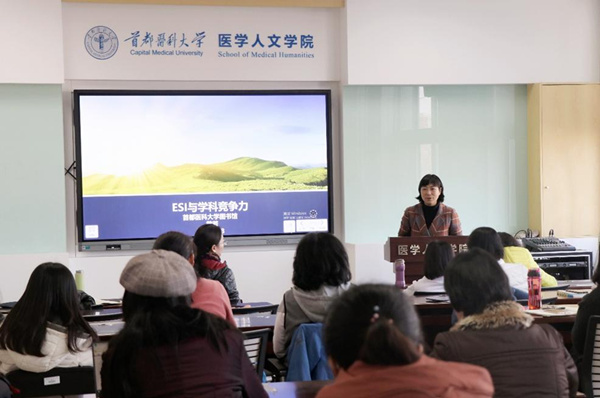 在前期图书馆帮助333体育 做学科分析报告和 web of science论文分析的基础上,黄芳馆长以《ESI与学科竞争力》为题,从国内外学科评估、学科数据来源、ESI的应用,包括ESI的收录范围、特点、研究前沿追踪以及如何利用医学文献数据库获得高水平期刊等方面进行了讲解。详尽的数据分析、可视化的呈现,清晰显示出333体育 学科在学校社会科学、临床医学评价中的潜力作用,她建议333体育 要充分利用数据库资源,注重科研实效和提升学术影响力,主要从内部提升、外部引进、基础保障三方面着手,不断提升学科竞争力。 讲座中,两位老师娓娓道来,内容紧贴实际,有很强的指导作用。与会教师认真聆听,在提问环节,对333体育 教师们提出的问题,王晶老师和黄芳馆长一一解答。两位老师的讲解调动了333体育 教师的热情和积极性,增强了教师的申报信心,提升了教师对学科分析指引科研开展的认知。