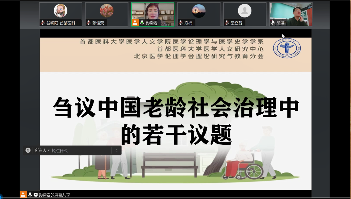 2024年3月28日上午10:00,333体育 医学人文研究中心、医学伦理学与医学史学学系邀请复旦大学老龄研究院副院长胡湛教授,为333体育 师生带来“刍议中国老龄社会治理中的若干议题”的专题讲座,此次讲座以腾讯会议在线方式举行。会议由医学人文研究中心副主任、医学伦理学与医学史学学系彭迎春副教授主持,学系全体师生线上参会研讨。