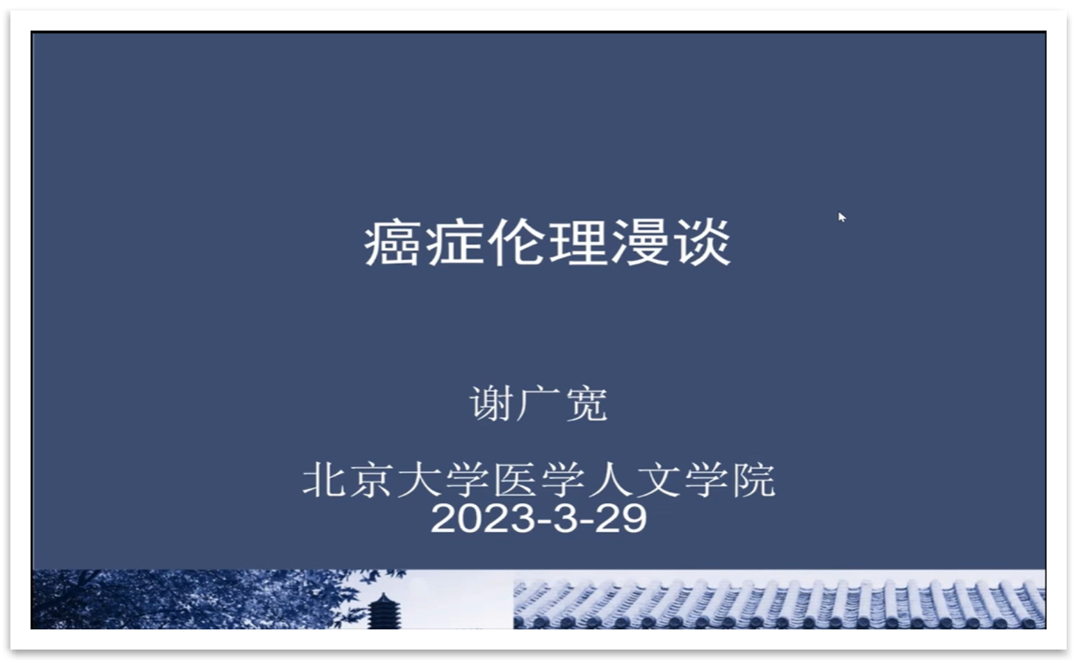 为活跃学术思想,加强学术交流,2023年3月29日上午9点,333体育 医学伦理学与医学史学学系邀请北京大学333体育 谢广宽老师为师生带来关于“癌症伦理漫谈”的线上学术分享,此次分享由学系主任梁立智副教授主持,来自临床、法学及伦理相关专业老师和学生们参加了此次培训与交流。 谢广宽老师主要从癌症的特点、癌症治疗中的伦理问题、癌症研究中的伦理问题和癌症筛查中的伦理问题四个方面为大家进行了深入浅出地讲解。首先,谢老师对癌症与肿瘤的概念进行区别,对癌症的发病率及其影响因素进行介绍,同时对癌症的特点进行总结:无限增生;治疗困难;治疗费用昂贵;预后往往不好;使大家对癌症有了一定的了解。紧接着以实际出发,对癌症治疗与实情告知问题进行讲述,从实证文章、相关案例、调查结果进行分析,对患病的实情告知相关争议进行聚焦讨论;从医学伦理学的尊重自主原则、不伤害原则、有利原则、公正原则出发,介绍了告知方式及沟通技巧,同时引用扁鹊见蔡桓公、华佗与曹操的故事,得出中国历史并不缺乏实情告知的传统。随后,就癌症临床研究与利益冲突进行举例讲解,强调了告知方式与沟通技巧是同等重要的。讲座的内容生动形象且贴近现实,使大家获益良多,同时也启发大家进行了积极的伦理思考。
