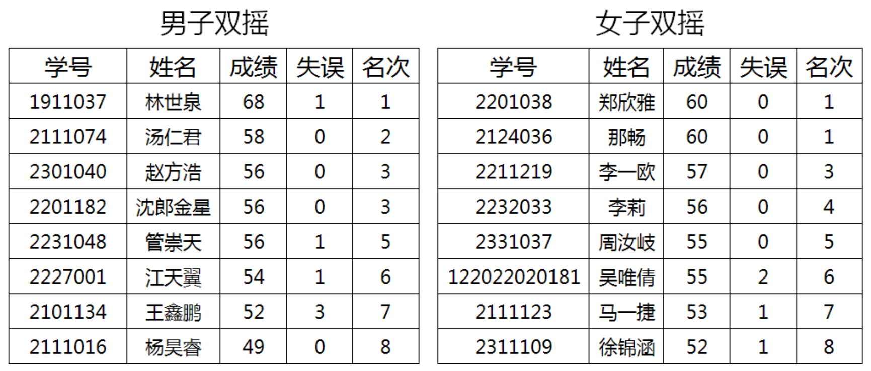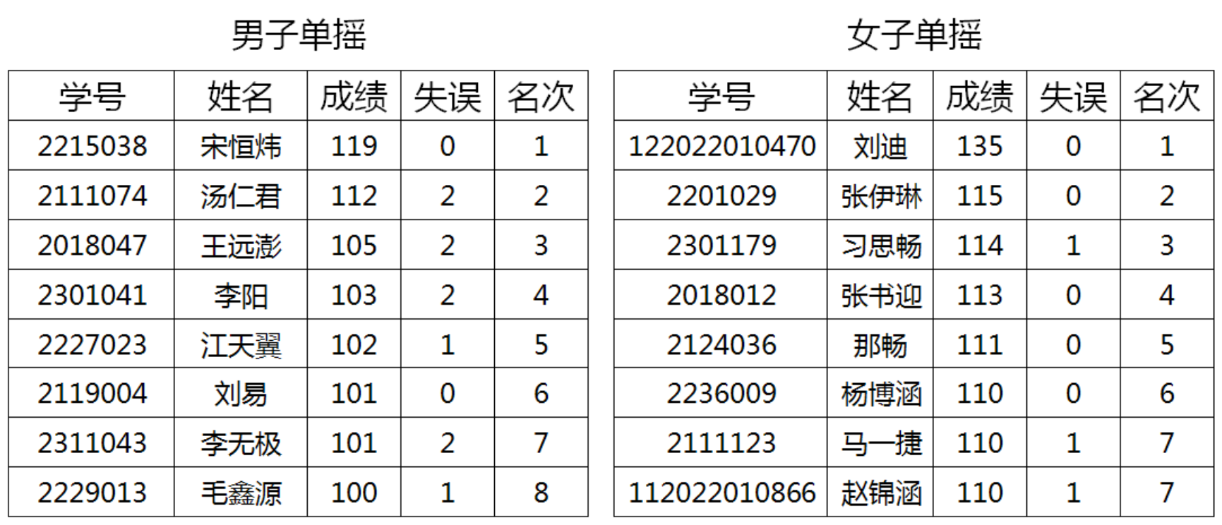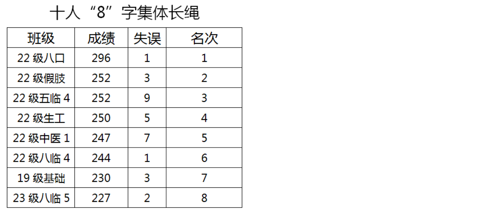11月8日,首医校本部的操场上人声鼎沸,一片热闹。比赛瞬间展开,精彩纷呈。各班选手都充满了斗志和热情。他们是对手亦是朋友,随处可见的是同学们在赛场上互相激励,为自己及班级争取荣誉。他们全心地投入到比赛中,尽全力展现出自己的技巧和速度,不断挑战自己的极限。经过激烈的角逐,最终宋恒炜,林世泉,刘迪,郑欣雅,分获男(女)单、双摇比赛第一名,22级八年口腔班获得十人“8”字集体长绳冠军,各项比赛成绩见附表。 医学生——他们不仅在专业课程中表现出色,而且在体育比赛中也展现了勇往直前、奋力拼搏的精神。体育比赛不仅是锻炼身体的机会,更是展现团队合作和竞技精神的舞台。这次比赛不仅丰富了校园生活,也增强了同学间的交流与团结。 通过比赛,同学们更加坚信只有拥有健康、强大的身体和积极的心态,才能更好地为梦想努力奋斗,成为一名更好的医学生。 附表:333体育 2023年秋季跳绳比赛获奖成绩
