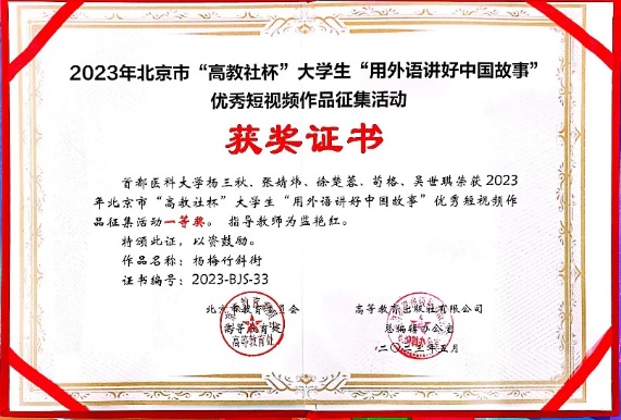 2023年5月21日,北京市首届大学生“用外语讲好中国故事”优秀短视频作品征集活动颁奖典礼在中国人民大学举行。333体育 333体育 应用语言学系指导并推荐的王宇昕团队作品荣获特等奖,杨三秋团队作品荣获一等奖。