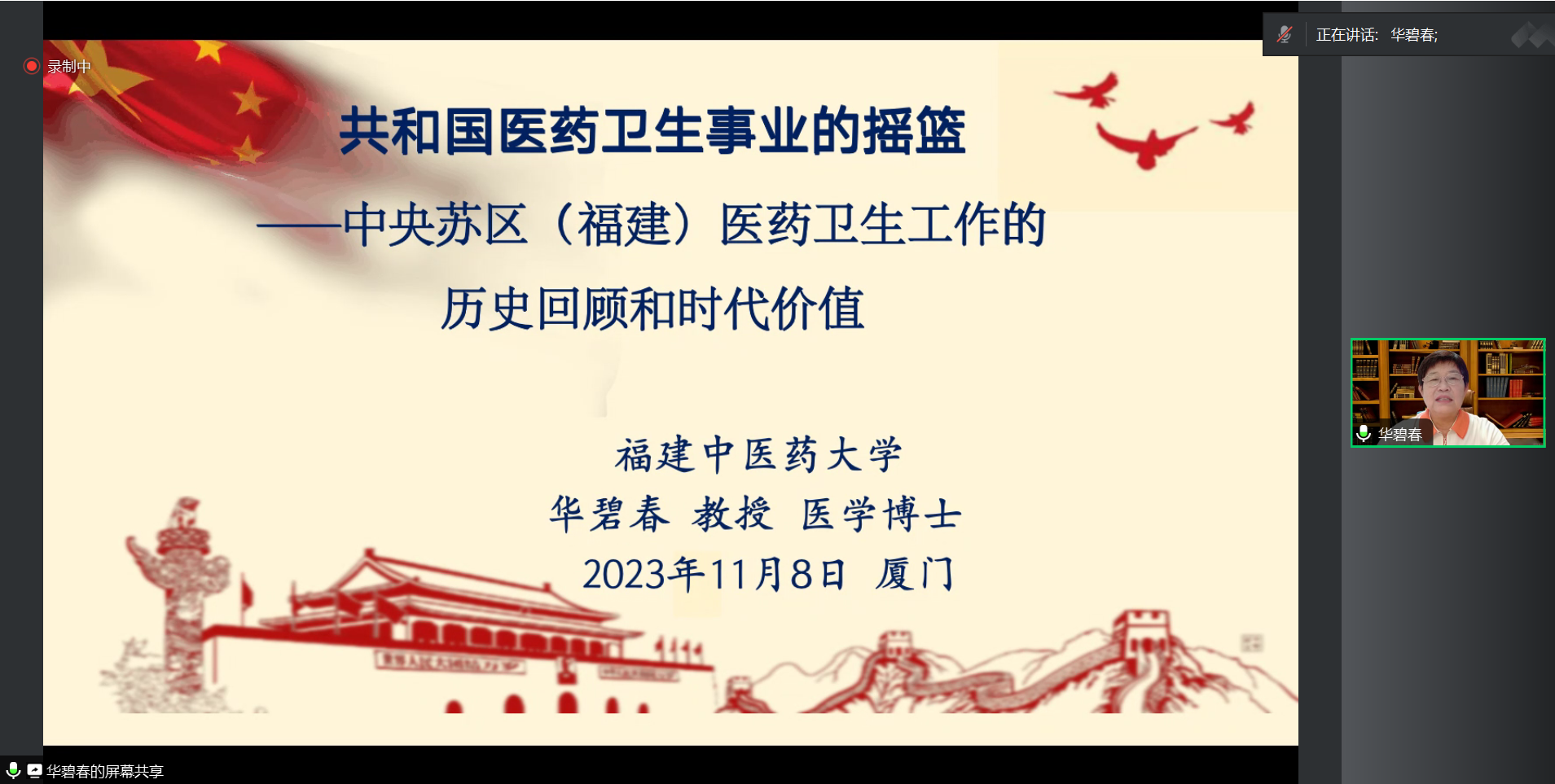 2023年11月8日晚,333体育 组织全体党员参加了由医学伦理学与医学史学学系党支部承办的党史专题讲座。本次活动特邀请福建中医药大学华碧春教授在线讲授了主题为“共和国医药卫生事业的摇篮——中共苏区(福建)医药卫生工作的历史回顾和时代价值”的讲座。本次讲座由医学伦理学与医学史学学系党支部书记彭迎春副教授主持。 讲座由两部分内容组成。第一部分,华教授对中央苏区(福建)医药卫生工作的历史回顾和时代价值进行了分享,利用各类翔实的史料,图文并茂地分享了包括中央苏区(福建)医药卫生组织机构的建立与工作举措、中央苏区(福建)红军医院的建立、中央苏区(福建)的中医药以及中央苏区(福建)的医药卫生人才在内四个方面的内容。华老师表示,中央苏区(福建)医药卫生史是中共党史、中国人民解放军军史和中国医学史的重要组成部分,依据习近平主席的指示,我们应该“把红色资源利用好,把红色传统发扬好,把红色基因传承好”,重视和广泛应用中医药。讲座的第二部分,华教授将自己从事中央苏区(福建)医药卫生史料研究多年来的调研经验以及体会跟参会成员进行分享。她向我们展示了多年来保留完整的每一次访谈记录,同时也分享了获取史料来源的经验,认为史料的搜集不能只是对所研究主题进行单一搜集,并举例中医药卫生的史料搜集,要从政治、经济、文化、军事等各类不同领域对医药卫生相关信息进行挖取和搜集。在讲座最后的自由提问交流环节,华教授针对大家所提出的问题一一予以耐心解答。 华教授聚焦于医药卫生工作的历史回顾及其对于时代价值的深入分析,既有史料的挖掘分析,也有北上南下、田间地头的实地调研,同时还有大量文物旧址的原图呈现。这一系列的研究方法及孜孜不倦的钻研精神,值得从事医学人文社会学科的研究者们去学习探究。也让全体党员们更深入地了解了党的奋斗历史和光荣传统,汲取力量和智慧,在新时代为党和人民做出自己的一份努力。