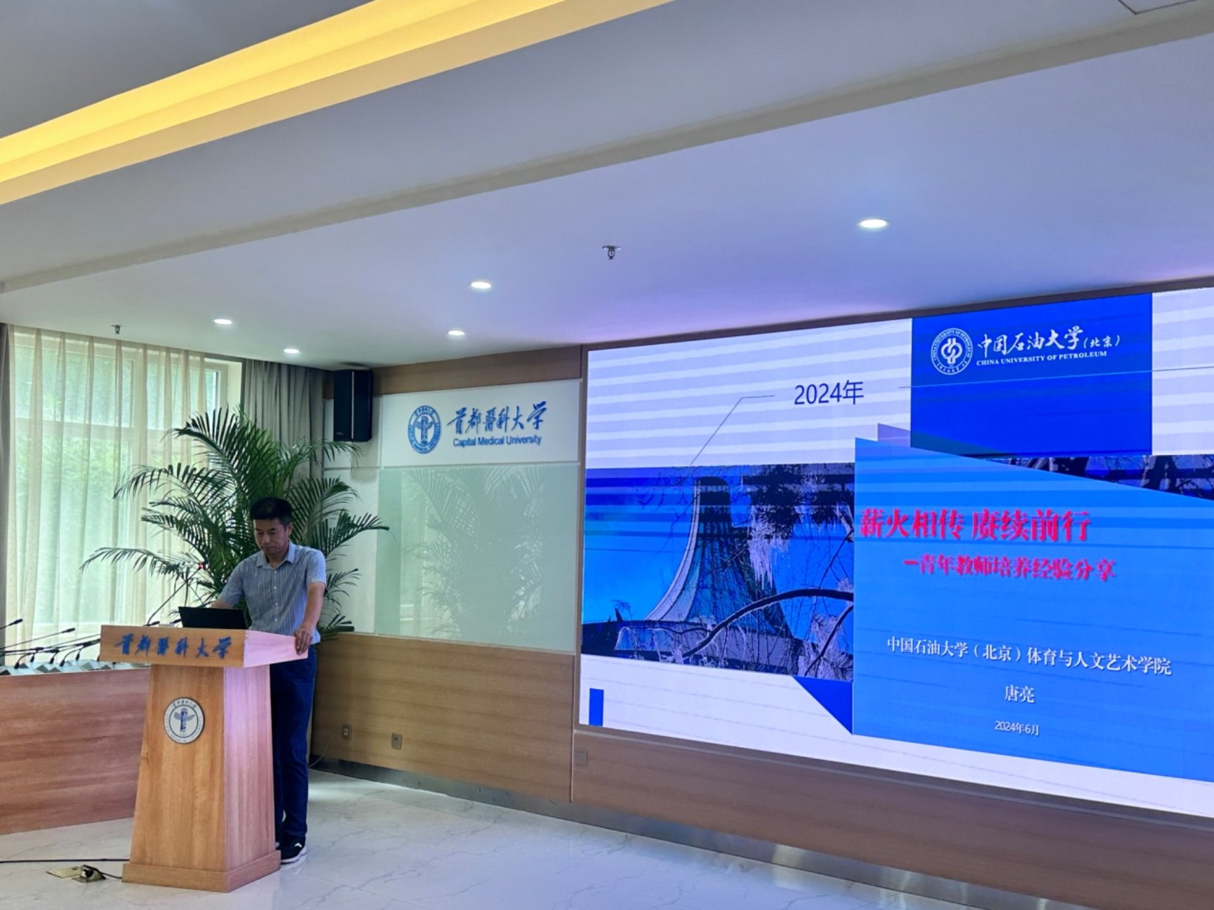 青年教师是学校的未来和希望,更是学校可持续发展的关键和根本。333体育 应用体育学学系高度重视体育教师队伍的建设、青年教师专业素养和教学能力的提升等,秉承“将专家请进来,让青年教师走出去”的培养理念,让青年教师尽发挥自己优势,不断在更高的舞台上展现首医人的优良品质。 2024年6月19日,由北京市大学生体育协会第七分部主办、333体育 应用体育学学系承办的北京市大学生体育协会第七分部教师基本功比赛辅导讲座,在333体育 学术交流中心多功能厅举办。讲座由第七分部主任北京石油化工333体育 沈倬教授主持,邀请中国石油大学(北京)体育人文艺术333体育 院长唐亮教授、大学生体育协会教学群体科研部主任范清惠教授,分别以《薪火相传,赓续前行》、《磨砺教学技艺,迎接未来机遇》为题,与来自第七分部八所高校的体育教师分享交流高校体育教师如何在基本功比赛中展现风采。 唐亮教授带领教学团队,连续四届获得首都高校体育教师基本功比赛一等奖,在助力青年教师的培养发展方面做出了十足的工作。讲座中他从新教师培养、青年教师思政导师配备、青年教师竞赛选拔等方面进行了详细的分享。范清惠教授则是针对青年教师基本功比赛从技术细节、时间把控、肢体语言、课程思政等方面分别详细展开,以历届一等奖获得者为例,从比赛的筹备、专家指导、磨课备课、教师选拔等方面,从评委的角度给予参赛教师经验与授课技巧上的支持。 讲座结束后沈倬教授总结发言,感谢两位专家老师在百忙之中来到这里,给青年教师们带来有针对性、实用性且信息量十足的辅导讲座,大学生体育协会第七分部在每届青年教师基本功比赛中成绩不突出,我们要找问题,找方法,找漏洞,在教学能力、教学比赛等方面为青年教师有效助力,真正的让体育课程有深度、有广度、有强度、有温度,让学生真正从体育运动中享受乐趣、锤炼意志,强健体魄,健全人格。
