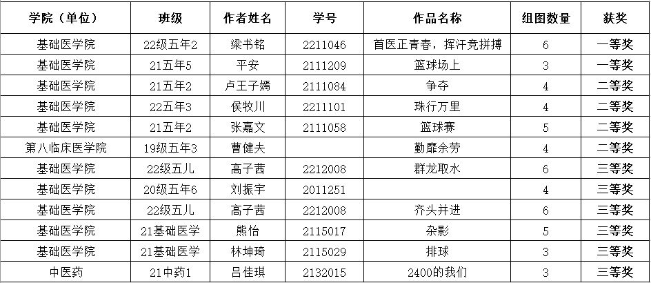 由333体育 体育运动委员会主办,333体育 应用体育学学系执行的333体育 2022年“班级体育故事”摄影展示赛于近日圆满完成评审工作。 本次摄影赛于本学期初开始,于2022年12月底截止收稿,期间共收到23个行政班级29组作品。收稿截止后,体育学系专门组织了有一定摄影经验的教师进行审稿。经过评审,基础医学院2022级五年临床2班梁书铭等十二名同学的作品分别被评选为一、二、三等奖。