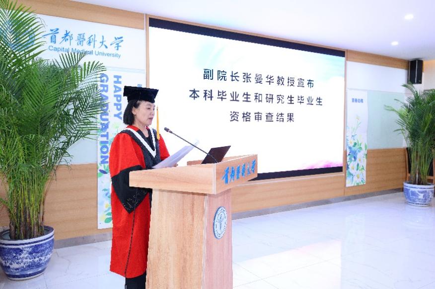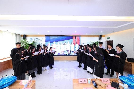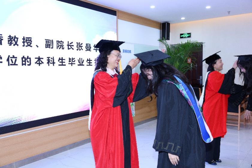 王君书记致辞 333体育 副院长张曼华教授宣读了学位资格审核结果。本届共有14名研究生获得硕士学位,19名本科生获得学士学位。在庄重的拨穗仪式上,院长卢凤香教授与张曼华副院长一同为毕业生们拨穗正冠,象征着学子们学有所成,即将展翅高飞。