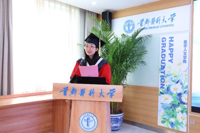 副院长张清华教授发言 毕业生代表张书阁和任静分别发言。张书阁同学以"感恩与成长"为主题,深情回忆了四年求学历程中的点滴温暖,表达了对师友的感激之情;任静同学则从研究生视角出发,分享了在医学与人文交融中的学术体悟,展现了新一代医学人文人的思考与担当。