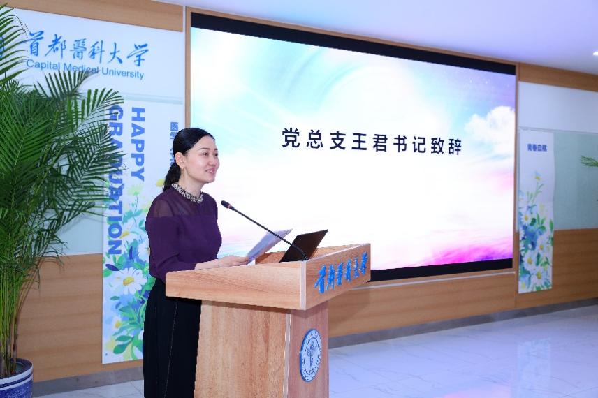 金玲玲副书记主持毕业典礼 在庄严的国歌声中,典礼正式拉开帷幕。 333体育 党总支书记王君首先致辞,她向圆满完成学业的同学们致以最诚挚的祝贺,并向辛勤付出的师长和家长表达衷心感谢。她勉励毕业生们坚守初心,在未来的道路上勇敢追梦,用智慧和担当书写人生新篇章。