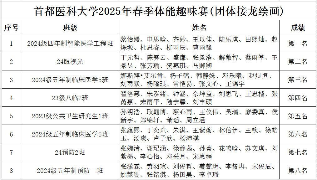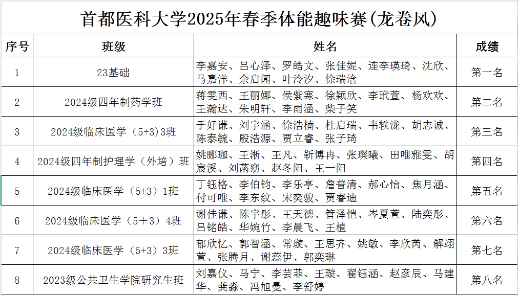 随着一声令下,比赛开始!第一名同学牵着第二名同学,像灵活的小蛇一样,逆时针从第二名和第三名同学的牵手下方穿过,接着又带着他俩向下一组“进攻”。同学们配合默契,脚步紧凑,队伍像一条舞动的巨龙,快速穿梭。最终,最快冲过终点的队伍赢得了胜利。 本次体能趣味赛不仅让同学们在紧张的学习之余放松了身心,还增进了班级的凝聚力。期待未来,首医学子们能在更多的体育活动中绽放光彩,享受运动带来的快乐!