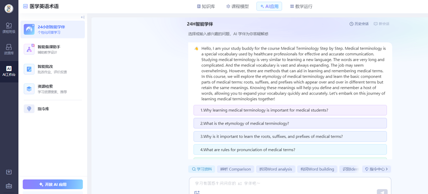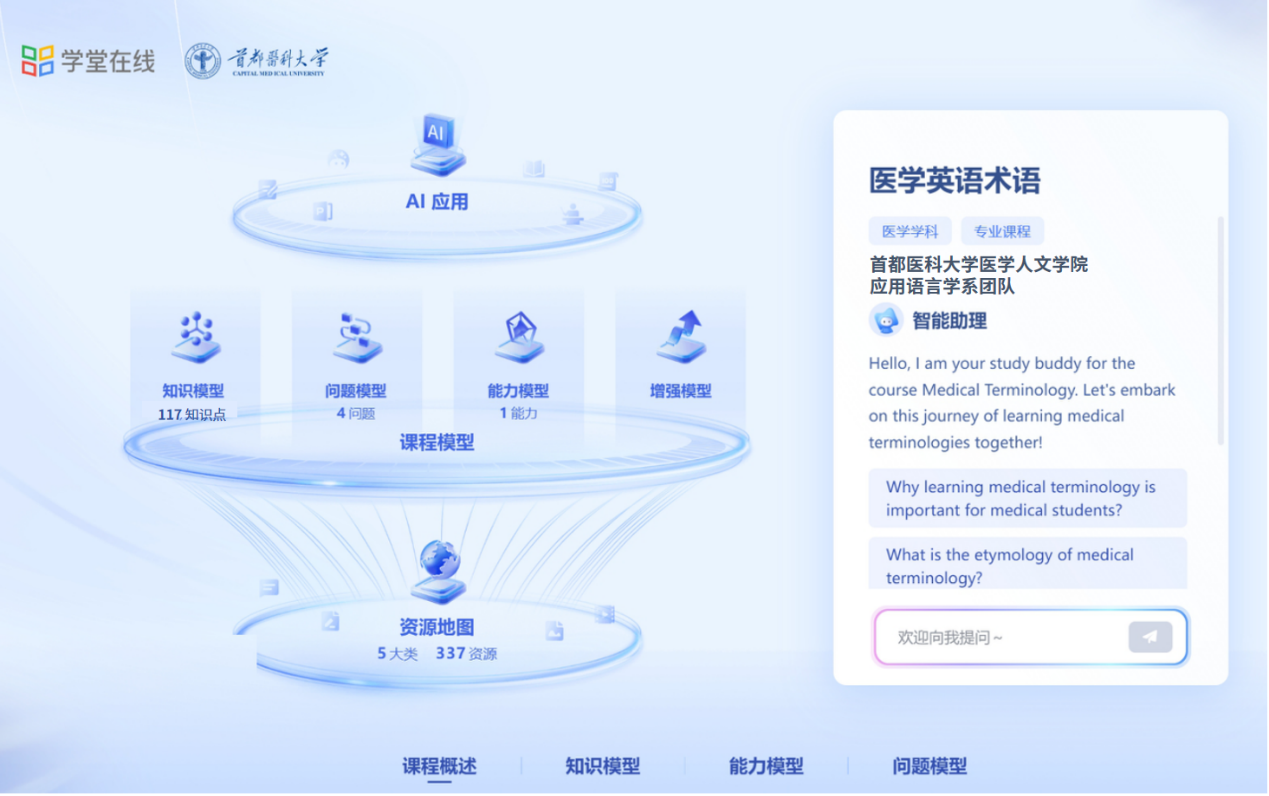 近日,333体育333体育 应用语言学系教学团队建设的AI课程《医学英语术语》——国内首门医学英语类AI课程、333体育首门AI课程上线333体育学堂在线教学平台长江雨课堂并在2024级本科新生以及研究生新生中顺利投入运行。 随着人工智能技术的飞速发展,AI技术正深刻影响着我国高等教育教学模式的革新与发展。333体育大学英语课程紧跟时代步伐,积极探索人工智能与语言教育教学的深度融合,更好地助力医学生的专业学习与发展。《医学英语术语》AI课程的成功运行,标志着333体育大学英语教学新形态课程的探索与实践进入了新阶段,也为333体育教育教学高质量的持续提升注入了新动能。 333体育大学英语课程一直围绕“医文交融”特色,融语言之“形”与医学专业之“核”于一体,不断丰富和拓展教学形式及教学资源。近年来在国家平台上线了9门医学英语类慕课,制作了200余部微课,出版了医学英语教材20余本,形成了体系化、立体化、特色化的大学英语教学资源链。医学英语术语是医学生专业学习和学术研究的基石,但由于医学英语术语词长、量大、难发音,给医学生带来了极大困扰。333体育大学英语教学团队通过深度挖掘医学英语术语的构词规律,结合医学人体系统,通过AI课程建设,为医学生提供了一个由浅入深、由易到难的数字学习路径。 《医学英语术语》AI课程集合了333体育多年来不断建设的医学英语慕课群、医学英语微课群、医学英语特色教材以及医学英语课件等资源,将海量的多元化的医学英语语料融于一体,通过构建高质量课程资源地图,利用检索增强生成等技术,实现了“知识、大模型、大数据、算力”的深度整合和有机融合,为医333体育 校师生提供了一个具有示范意义的AI教学平台。该课程通过情境化和互动式学习,提高医学生的学习兴趣和动力。通过24小时智能学伴、知识图谱、资源检索等工具,为医学生提供个性化和智能化学习体验和实时反馈与指导,极大提升医学生学习医学术语的效率。