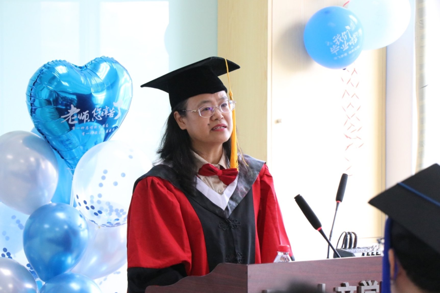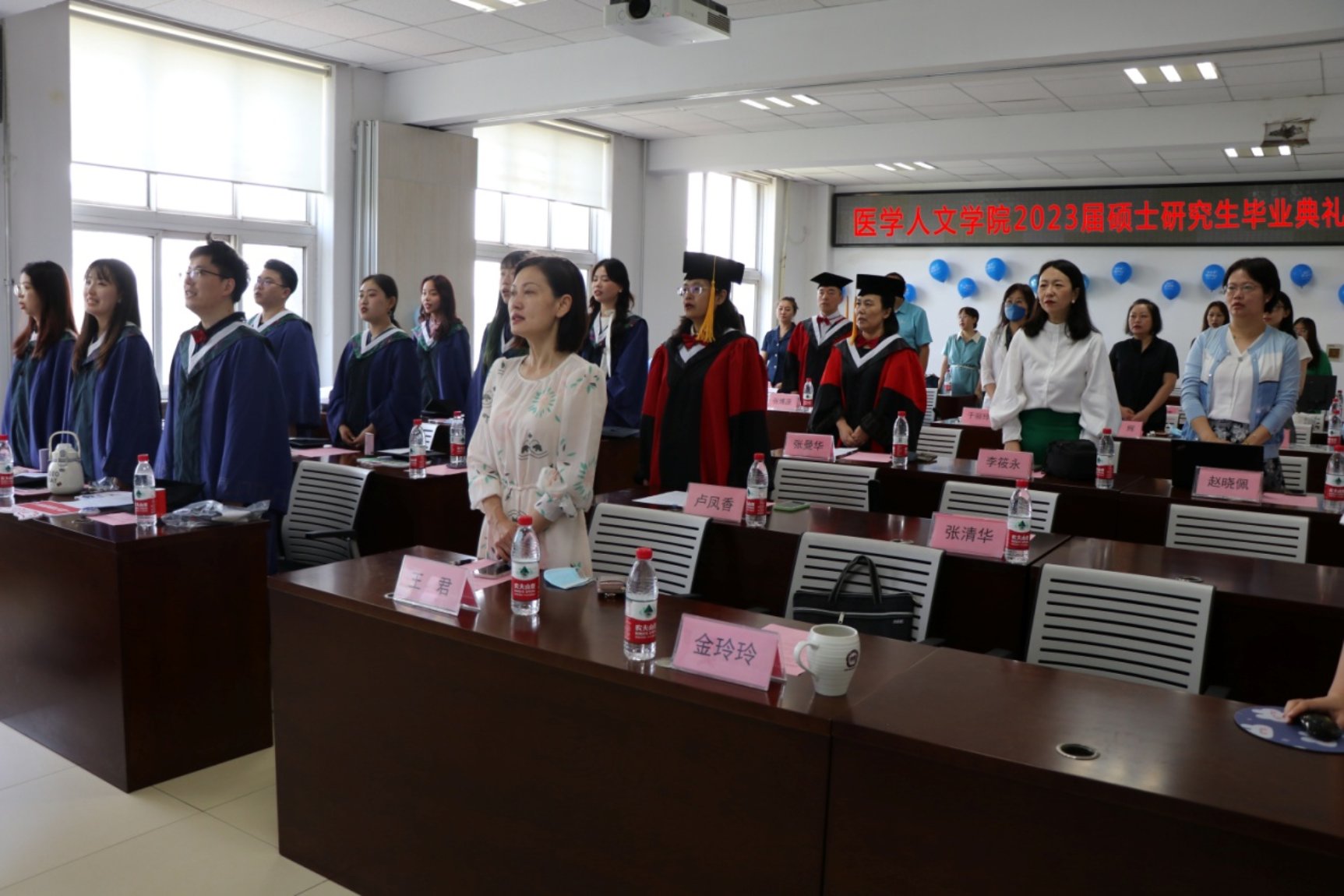 毕业生们集体以歌声表达了对老师们的感谢,对友情、青春的美好回忆。 庄严而充满仪式感的时刻到来,卢凤香教授为身穿学位服的毕业生获得硕士学位的毕业生拨穗,并给毕业生们讲授最后一课。卢院长鼓励大家努力向前,积极追求目标和梦想的同时,也要“守规矩不任性,冷思考不盲从,追光亮不沮丧”特别强调了“留一线空间”的重要性,这是一种智慧的人生态度,对于即将踏上新征程的毕业生来说,是一份珍贵的激励和关爱。