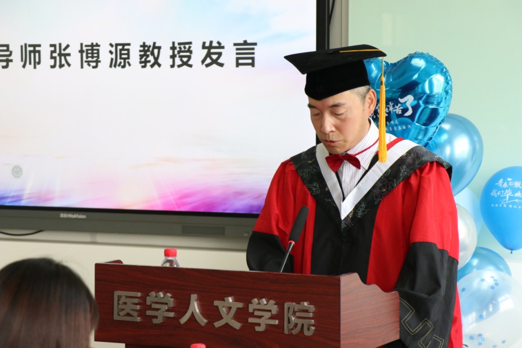 导师是学生求学路上的引路人,是心灵的指引者,也是学生求学旅程中的知心朋友和坚强后盾。研究生导师张博源教授首先表达了对同学们的祝贺,祝贺同学们超越了自我,赢得了成长;祝贺同学们结缘良师,收获了信任;祝贺同学们铸就了医学人文精神信仰,成为医学人文使者。以他丰富的教育经验和深厚的学术造诣,送给同学们毕业之际的人生指引和真挚的祝福,并叮嘱同学们“”责任与担当比什么都重要!责任永远高于热爱。唯有责任,你才能在工作中发现你们的热爱。”