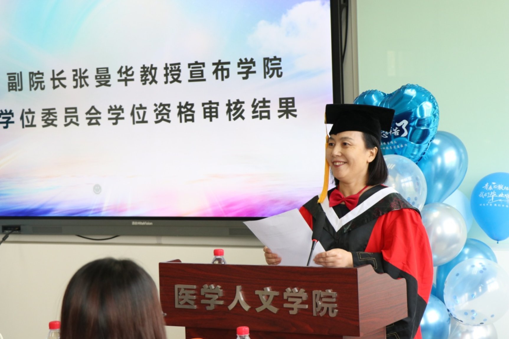 学院副院长张曼华教授宣布学院学位委员会学位资格审核结果和学院优秀毕业生名单,共有9名毕业生顺利获得硕士学位。