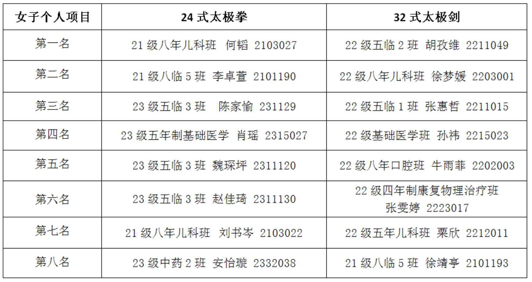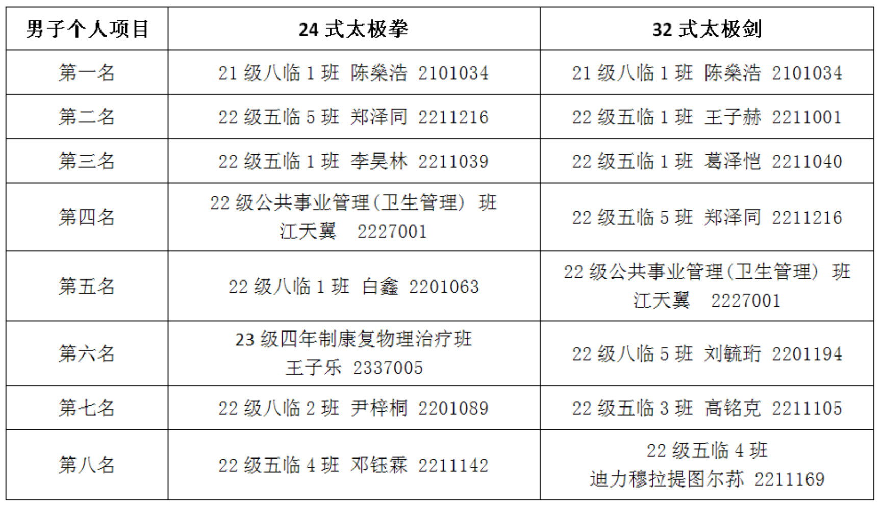 2023年11月27、30日,由校体育运动委员会主办,应用体育学学系承办的333体育 太极拳(剑)比赛在333体育 体育馆一层顺利举办。本次大赛面向333体育 右安门校区学生,以班级为单位报名,分为集体项目和个人项目两大环节,包括24式太极拳、32式太极剑,为学生们提供了一个展现自身实力和交流技艺的平台。比赛吸引了97名学生报名个人项目,17个班级共138名学生报名集体项目,展现出同学们对太极拳(剑)赛事的热情。