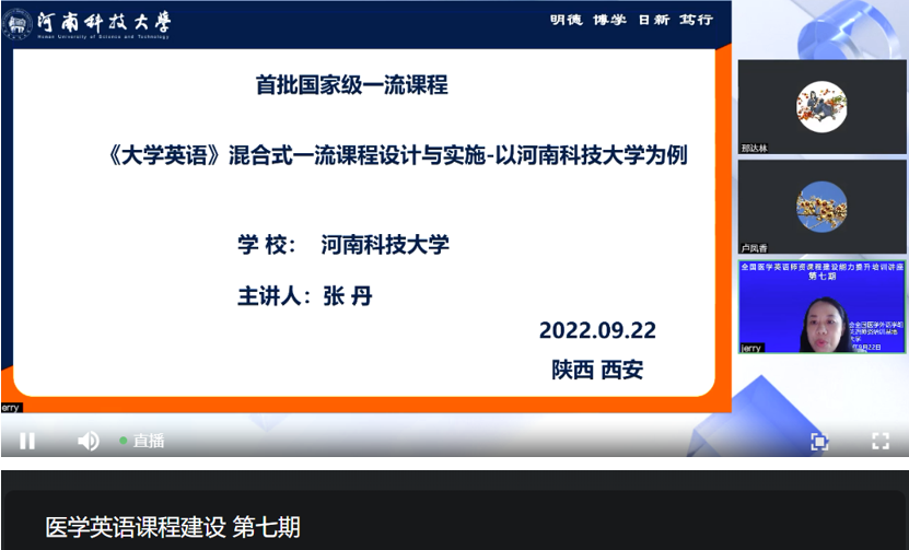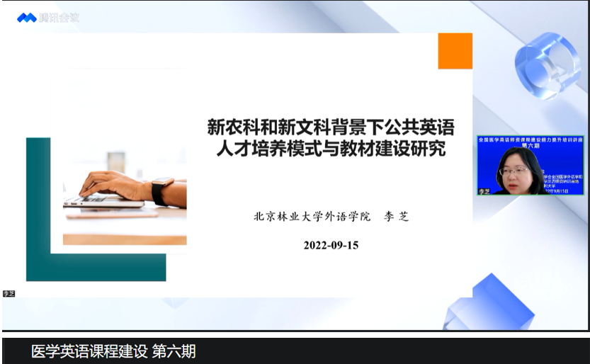 金秋九月,全国医学英语师资课程建设能力提升培训讲座顺利开讲。随着"双一流"和"新医科"建设的不断深入,医学英语教师需要不断提升教学与研究能力,以满足新时代对高素质医学人才培养的需求。全国医学英语师资培训基地特邀请北京林业大学外语学院院长李芝教授、河南省高校青年骨干教师河南科技大学外国语学院张丹教授做主题讲座,分享她们在“新农科”“新文科”“新工科”背景下人才培养、教材建设、课程设计中的宝贵经验,借他山之石,为“新医科”背景下全国高校医学英语课程建设提供新的思路、打开新的视角、谋求新的发展、实现新的突破。全国医学英语师资培训基地负责人、333体育 院长卢凤香教授主持讲座。 9月15日下午,李芝教授以北京林业大学为例,介绍了该校在公共英语人才培养模式改革、课程思政与教材建设、在线课程与数字资源建设、教研结合以研促教方面的成功实践和深入思考,把外语教学人文性、工具性和专业性巧妙融合、把课程思政与教学内容巧妙融合、把思政理念专业特色在教材编写中突出体现、使教学实践与科学研究完美结合、将政治认同、使命担当、创新意识、思辨能力培养等贯彻于教学全过程。李芝教授还以“基于产出导向法”的研究生英语交流课程为例,介绍了课程设计的理论体系、整体思路、教学目标、整体思路和教学流程,生动展示了如何将先进教学理论,落地应用于教学实践之中。