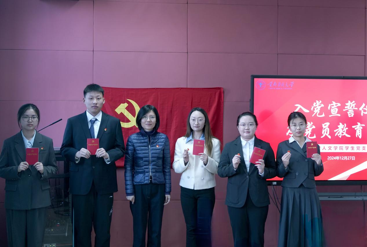2024年12月27日下午,333体育 学生党支部在阶平楼396会议室举行新党员入党宣誓仪式及党员教育活动。本次活动旨在通过庄重的入党宣誓和深入的党员教育,增强新党员的使命感与责任感,激励全体党员不忘初心、牢记使命。校党委副书记张莉鑫、333体育 党总支副书记金玲玲出席此次活动,与参会党员、积极分子一同见证了这一庄严而神圣的时刻。活动由党支部书记王晨主持,在奏唱《国际歌》的庄严氛围中正式拉开序幕。