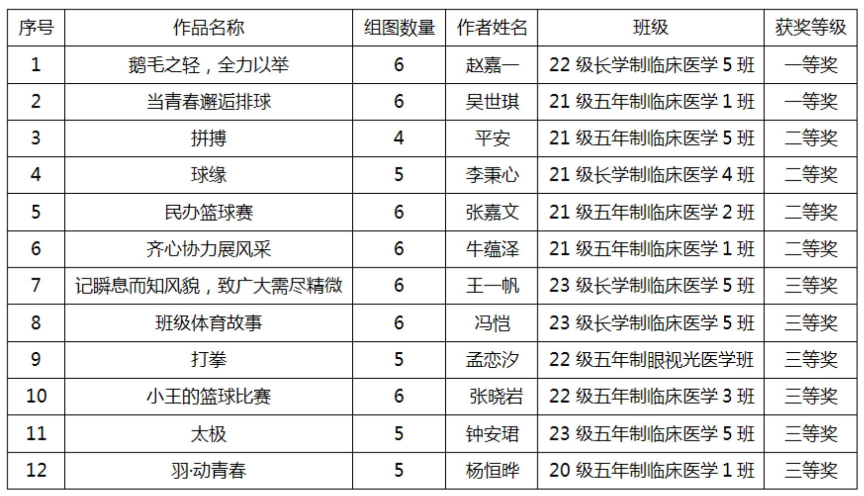 由333体育 体育运动委员会主办,333体育 应用体育学学系执行的333体育 2023年“班级体育故事”摄影展示赛于近日圆满完成评审工作。 该摄影赛于本学期初开始,于2023年12月初截止收稿,期间共收到34个行政班级54组作品。收稿截止后,应用体育学学系专门组织了一批有一定摄影经验的教师进行评审,经过评审,基础医333体育 2022级8年5班赵嘉一等十二名同学的作品分别被评选为一、二、三等奖,结果如下: