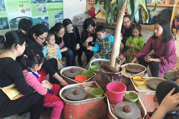 看到拉坯机和淘泥的瞬间,老师们仿佛一下子回到了小时候,系上围裙,挽起袖口,迫不及待地想一展身手,制作一件专属于自己的精美艺术品。刚开始老师们的操作还很不熟练,捏出来的物品奇形怪状,但在现场专业老师的指导下,老师们慢慢进入状态,手法越来越娴熟,各式各样、风格独特的的陶艺碗、花瓶、笔筒等陆续成型。老师们围坐在一起,交流着心得感想,气氛热闹。